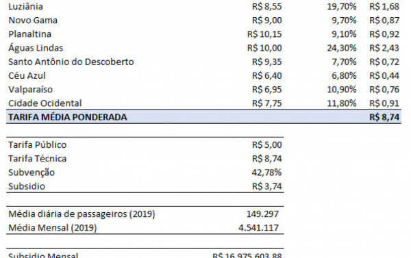 Assim, a diferença entre o que seria cobrado dos passageiros (R$ 5,00) e a tarifa técnica (R$ 8,74) é de R$ 3,74. Esse seria o valor do subsídio a ser custeado pelo DF e GO.