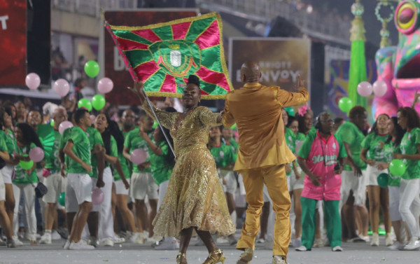 Furacão, esgarça a bandeira, a estica no seu limite, faz ventar na Avenida. Dono de um belíssimo repertório de passos e mesuras, Matheus sabe da força que tem ao seu lado; mais do que protegê-la — função básica do mestre-sala —, ele trata de garantir condições para a evolução da parceira. É como se anunciasse: cuidado que a Cintya vem aí, é bom se segurar.