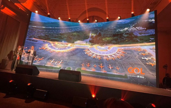 Sensacional foi uma montagem com uma foto na apresentação de Celso Ferrer: uma imagem do Galeão totalmente ocupado por aviões da Gol. O aeroporto ganhou uma empresa aérea para chamar de sua agora.