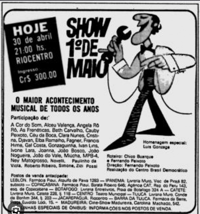 Também no Primeiro de Maio de 1981, tenho memórias dolorosas. A bomba do Riocentro planejada pelos extremistas da direita que, graças a Deus, não explodiu dentro do evento que reunia milhares de pessoas para assistir às estrelas da MPB em protesto contra a ditadura militar, que já definhava. Na verdade, o evento foi na noite de 30 de abril, mas só saímos do Riocentro já no primeiro de maio. Não por força do ataque espúrio e malogrado, mas pela linda festa de dezenas de artistas com milhares de brasileiros ávidos por democracia. Deus impediu a explosão da bomba dentro do evento. O show era organizado pelo CEBRADE, Centro Brasil Democrático, onde eu trabalhava sob o comando de Oscar Niemeyer, Renato Guimarães e Vinícius França. O privilégio de reuniões com intelectuais e artistas para organização de eventos durante todo o ano, sempre com foco na resistência democrática ao regime autoritário, foi um grande privilégio e aprendizado. O cartaz de quase todos os nossos eventos durante o ano eram criações do mestre Ziraldo.