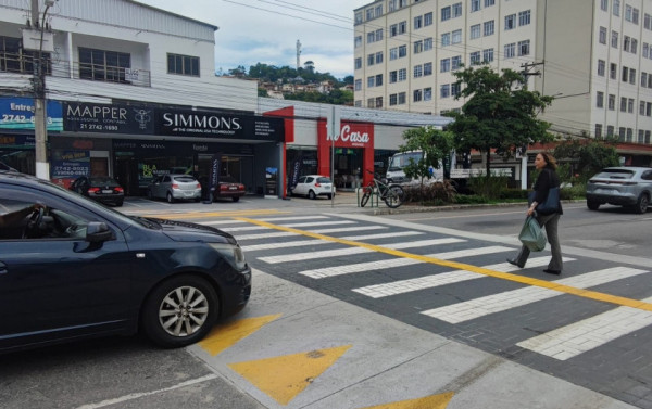 Correio Serrano 06 de dezembro de 2023 - 00:01 Por: TERESOPOLITANAS Pedestre atravessa faixa elevada na reta | Foto: Bruno Bacil