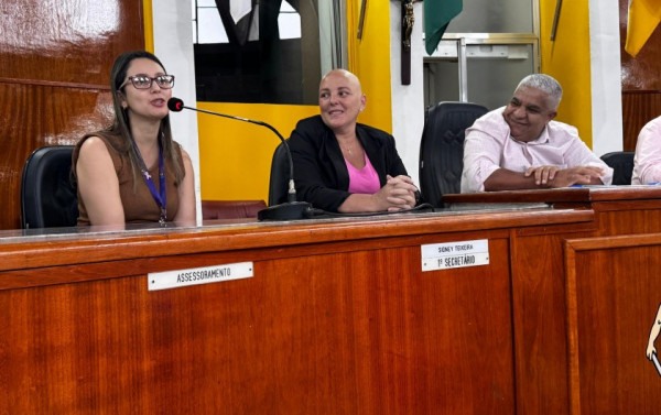 A vereadora eleita por Volta Redonda (2025-2028), Gisele Klingler, participou nesta segunda-feira (21), de um evento em alusão ao ´Outubro Rosa´, na Câmara de Vereadores. Também participaram do encontro o presidente da Casa, Edson Quinto, e os vereadores Neném, Cacau da Padaria e Francisco Novaes. Gisele, eleita vereadora na eleição de outubro, descobriu que estava com câncer de mama em maio deste ano. Ela relatou como foi a descoberta do diagnóstico e a importância do autoexame: "Eu descobri meu câncer através de um autoexame da mama. É importante a mulher conhecer seu corpo, fazer o toque. Eu senti um caroço", contou.