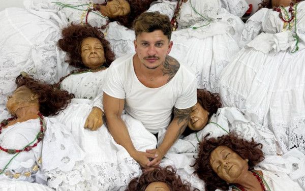 Foi uma experiência incrível e um verdadeiro privilégio ter recebido o convite de Leandro Vieira, um mestre do carnaval, para mergulhar na vida dessa mulher que foi um ícone da religiosidade afro-brasileira. Foi uma oportunidade única de me aprofundar em sua história e retratar sua imagem na escola de samba. Durante cinco meses intensos de criação e construção, reuni um fotos e imagens de Cacilda, uma das maiores mães de santo dos anos setenta e oitenta no Brasil. O objetivo deste projeto era representá-la de maneira realista, mas, ao mesmo tempo, intensificar sua expressão emocional e sua identidade. Foram 15 bonecas em escala humana, esculpidas e trabalhadas com extremo cuidado. Contei com o apoio da minha equipe de confecção e com o figurino poético da figurinista Tereza Nabuco, minha grande parceira na arte, que tem um olhar magistral na criação de figurinos, especialmente os inspirados nas matrizes afro-brasileiras.