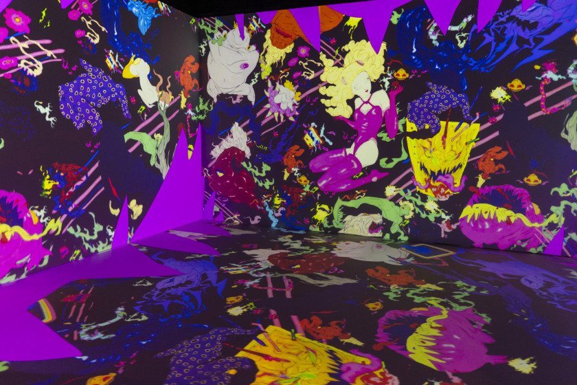 A exposição divide-se em sete núcleos temáticos. O núcleo Tatsunoko reúne trabalhos do início da carreira, incluindo células de animação — folhas transparentes de acetato usadas na animação tradicional. Angel's Egg apresenta obras de 1985 que originaram o filme homônimo de 1985, realizado em parceria com Mamoru Oshii, quase sem diálogos e descrito como meditação sobre fé e solidão. Candy Girl mostra pinturas feitas com tinta automotiva sobre alumínio desde os anos 2000, misturando fantasia, pop art e surrealismo com cores vibrantes.