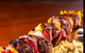 Nada melhor do que churrasquinho na brasa, nosso favorito desde sempre. E nos veio o Espetão, com maiúscula. Pedaços robustos de filé-mignon com 3 acompanhamentos, que se escolhem do cardápio de oferecido. No clima de volta ao passado, pedimos guarnição à francesa (aquela batatinha palha com presunto, ervilha e cebola), feijão tropeiro e arroz de brócolis. Em uma leitura parece que não combina. Tudo dá certo porque com o Espetão estão os pedaços de cebola, tomate, pimentão vermelho e amarelo, com a tragédia do verde longe de nossos pratos.