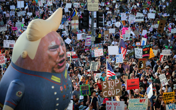 Uma coalizão composta por dezenas de grupos de esquerda, como MoveOn e Marcha das Mulheres, convocou manifestações sob o lema "Hands Off" (tire suas mãos) em mais de mil cidades americanas. Segundo os organizadores, cerca de 600 mil pessoas aderiram aos atos nos EUA e em outros países. Em Washington, pelo menos 5.000 se reuniram perto da Casa Branca.