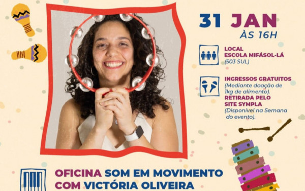 A 4ª edição do Festival Em Cantos promoverá, no sábado (31), às 16h, a oficina Som em Movimento, na Escola de Música MIFÁSOL-LÁ, na Asa Sul (DF). A atividade é voltada a crianças de 2 a 5 anos acompanhadas dos responsáveis. A atividade será conduzida por Victória Oliveira, com uma proposta de vivência corporal que reúne som, movimento e interação familiar.