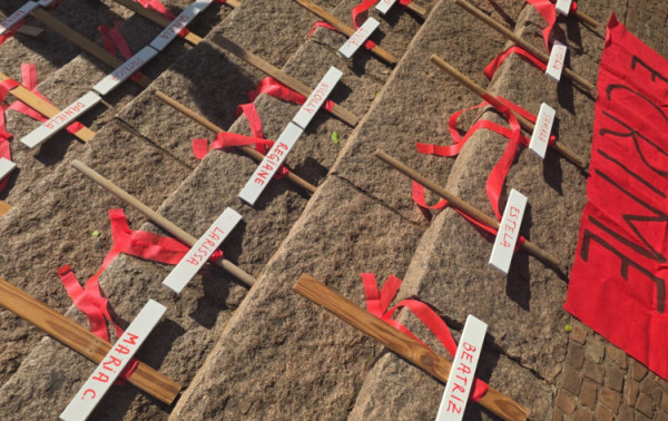 Uma performance foi realizada com 27 cruzes, com os nomes das 27 mulheres que sofreram feminicídio na região (24 foram assassinadas em 2025 e três em 2026).