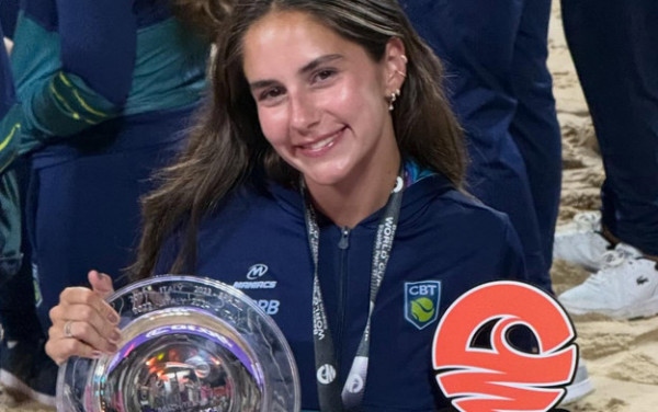 Isabela Massaioli, de 18 anos, do CT Lucas Sousa, de Campinas, e da BEAT Sports Manager, celebrou o encerramento de uma temporada histórica com a conquista do bicampeonato da Copa do Mundo de Beach Tennis na categoria juvenil, realizada em Ribeirão Preto (SP).
