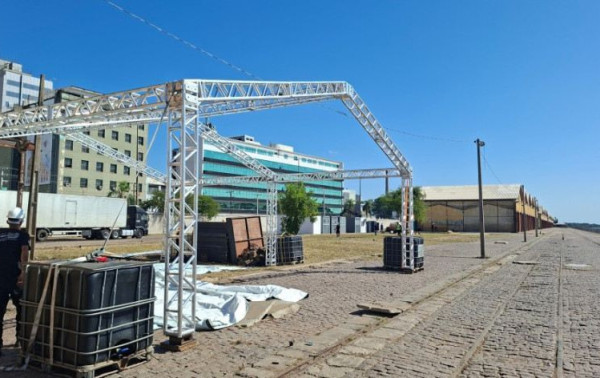 A montagem da estrutura entra na fase final e mobiliza equipes técnicas na adaptação de armazéns e áreas externas, que abrigarão palcos, estandes e espaços voltados à circulação de visitantes durante os dias de programação.