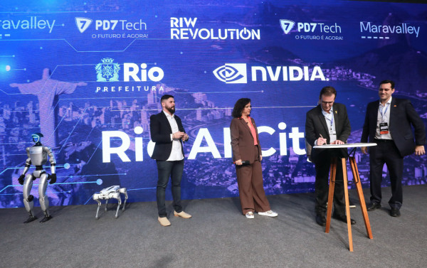 A Prefeitura do Rio firmou, nesta quinta-feira (14), no terceiro dia do Rio Innovation Week, parcerias para desenvolver três iniciativas de inteligência artificial. O Rio será a primeira cidade da América Latina a ter o selo NVIDIA AI City. A multinacional norte-americana irá instalar um supercomputador no Porto Maravalley. Em parceria com a Agência Brasileira de Desenvolvimento Industrial e a PUC-Rio, foi lançado o programa Rio.IA - Hub Carioca de Inteligência Artificial, também no Porto Maravalley. E o prefeito Eduardo Paes assinou um memorando de entendimento com a multinacional norte-americana de tecnologia Oracle e a Elea Data Centers para impulsionar o Rio AI City.